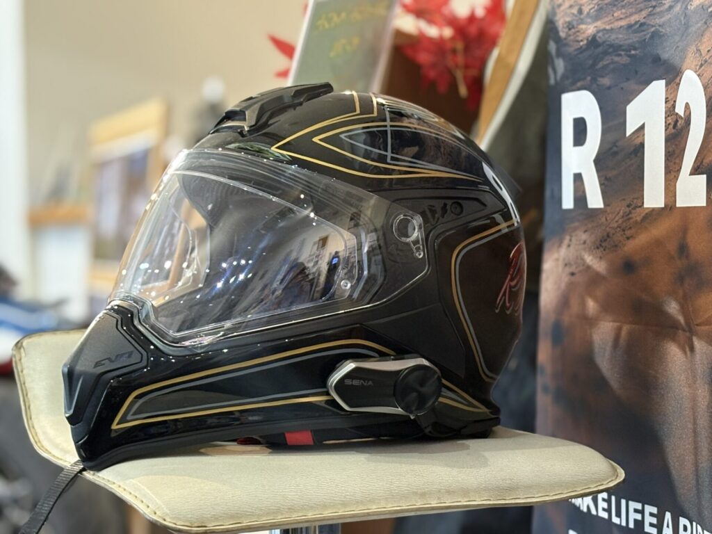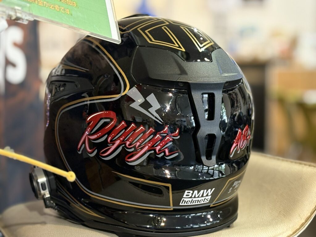 当店のセールス昌山とサービス安村のヘルメットにもフリーハンドでのペイントを施してもらい、ショールームにサンプルとして展示してあります。